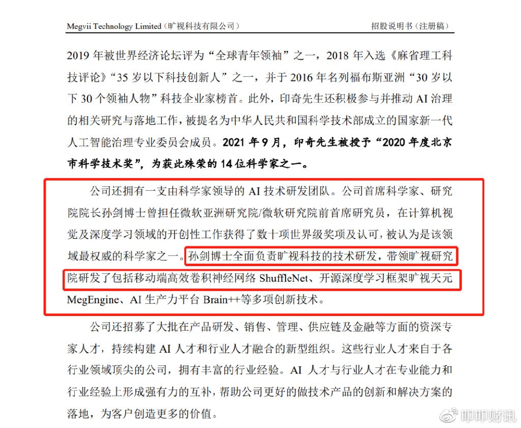其后,旷视科技同样在“公司竞争优劣势”内容下的“富有远见的管理团队和融合性人才体系”的表述中,还继续强调“公司还拥有一支由科学家领导的 AI 技术研发团队。公司首席科学家、研究院院长孙剑博士曾担任微软亚洲研究院/微软研究院前首席研究员,在计算机视 觉及深度学习领域的开创性工作获得了数十项世界级奖项及认可,被认为是该领 域最权威的科学家之一。孙剑博士全面负责旷视科技的技术研发,带领旷视研究 院研发了包括移动端高效卷积神经网络 ShuffleNet、开源深度学习框架旷视天元 MegEngine、AI 生产力平台 Brain++等多项创新技术。”