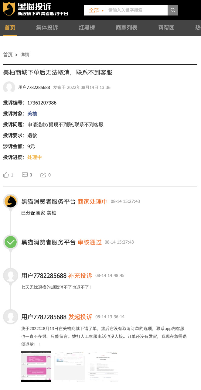 在黑猫投诉[投诉入口]平台上,在对于商家美柚的投诉内容中,关于退款困难、无法有效联系到客服问题较为明显。